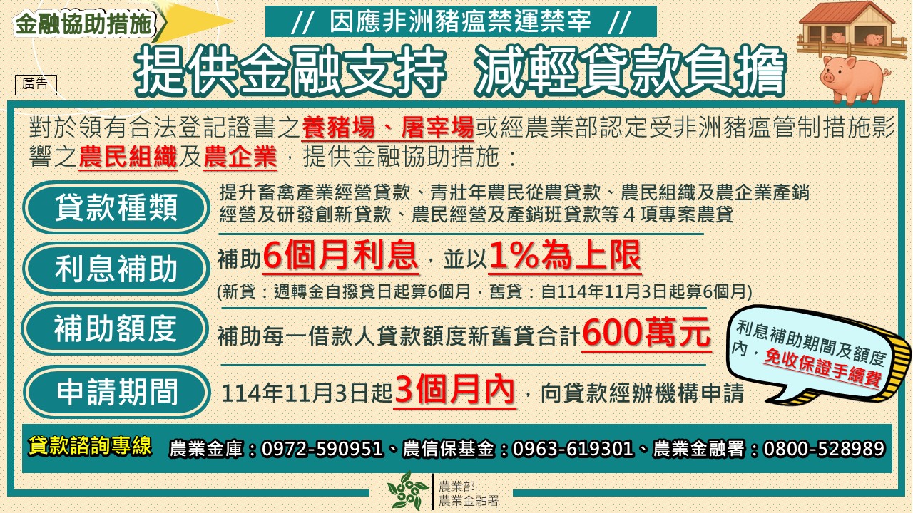 因應114年非洲豬瘟疫情,農業部為協助受禁運、禁宰影響之養豬相關業者,減輕其資金壓力並維持產業穩定,自114年11月3日起提供「因應非洲豬瘟受禁運禁宰影響養豬業者利息補助措施」(下稱本措施),對領有合法登記證書之養豬場、屠宰場,或經農業部認定受影響之農民組織與農企業,提供4項政策性農業專案貸款(下稱專案農貸)新貸及舊貸合計最高貸款額度600萬元之6個月利息補助,以1%為上限,貸款利率由現行大多1.915%補助後為0.915%,預估受益戶數1,500戶,可節省養豬業者4,500萬元之利息支出。